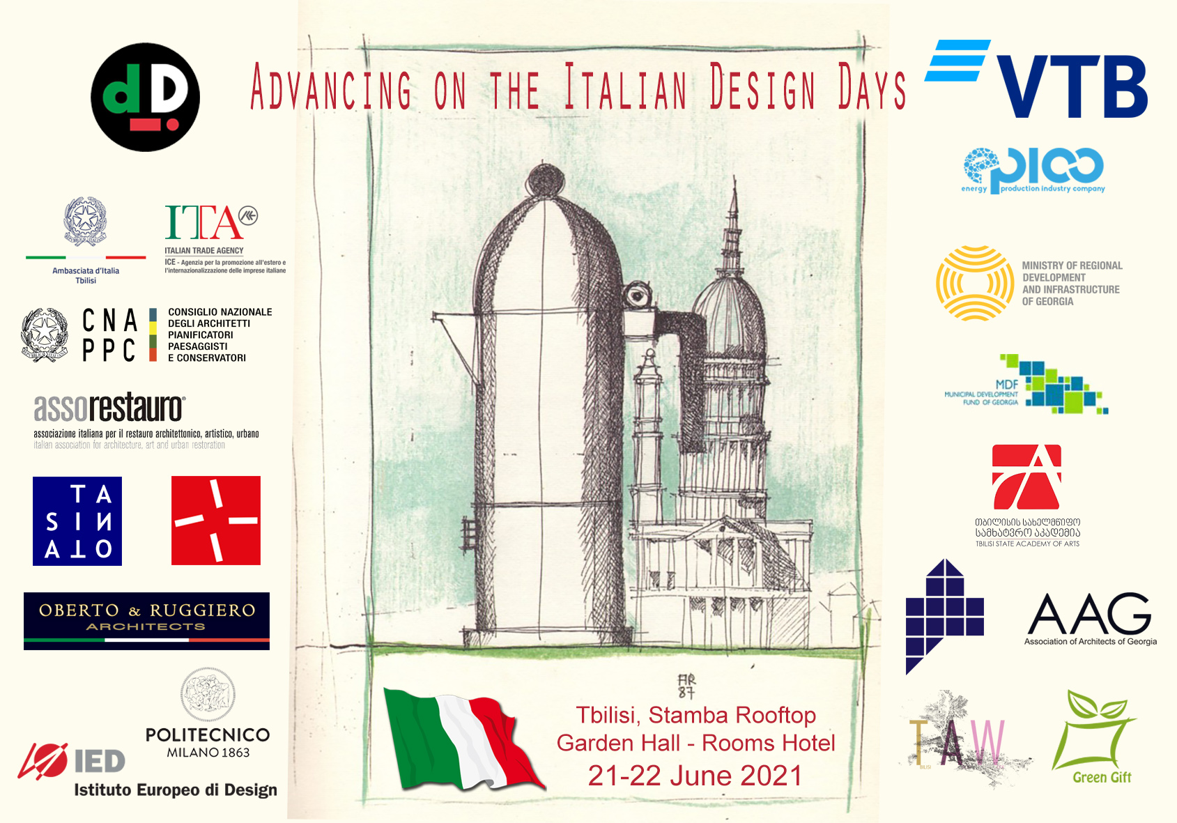Il Consiglio Nazionale Architetti Pianificatori Paesaggisti e Conservatori ha messo a disposizione le tavole del premio annuale "Architetto Italiano", oltre a contribuire alla sessione principale di lavori che si terrà in data 22 giugno e che consisterà in un workshop volto a stimolare l’interazione tra imprese, studiosi, esperti ed associazioni di categoria attive tra Italia e Georgia nei settori dell’architettura e del design. Ad intervenire, il Consigliere Nazionale Alessandra Ferrari.